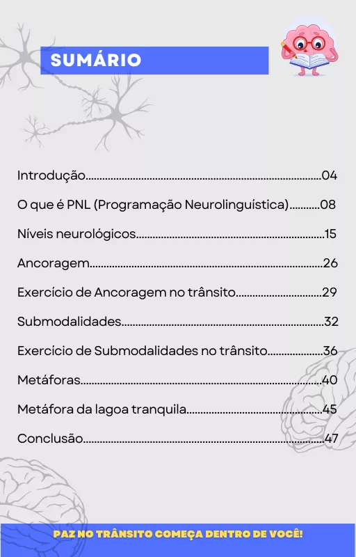 Com o e-book "Paz no Trânsito começa dentro de você", descubra técnicas de PNL para diminuir o estresse, aprimorar a comunicação e criar um ambiente mais seguro e harmonioso no trânsito. Aprenda a desenvolver o autocontrole emocional e a trocar hábitos negativos por atitudes positivas. Adquira o e-book agora e proporcione uma experiência mais calma e produtiva no trânsito.